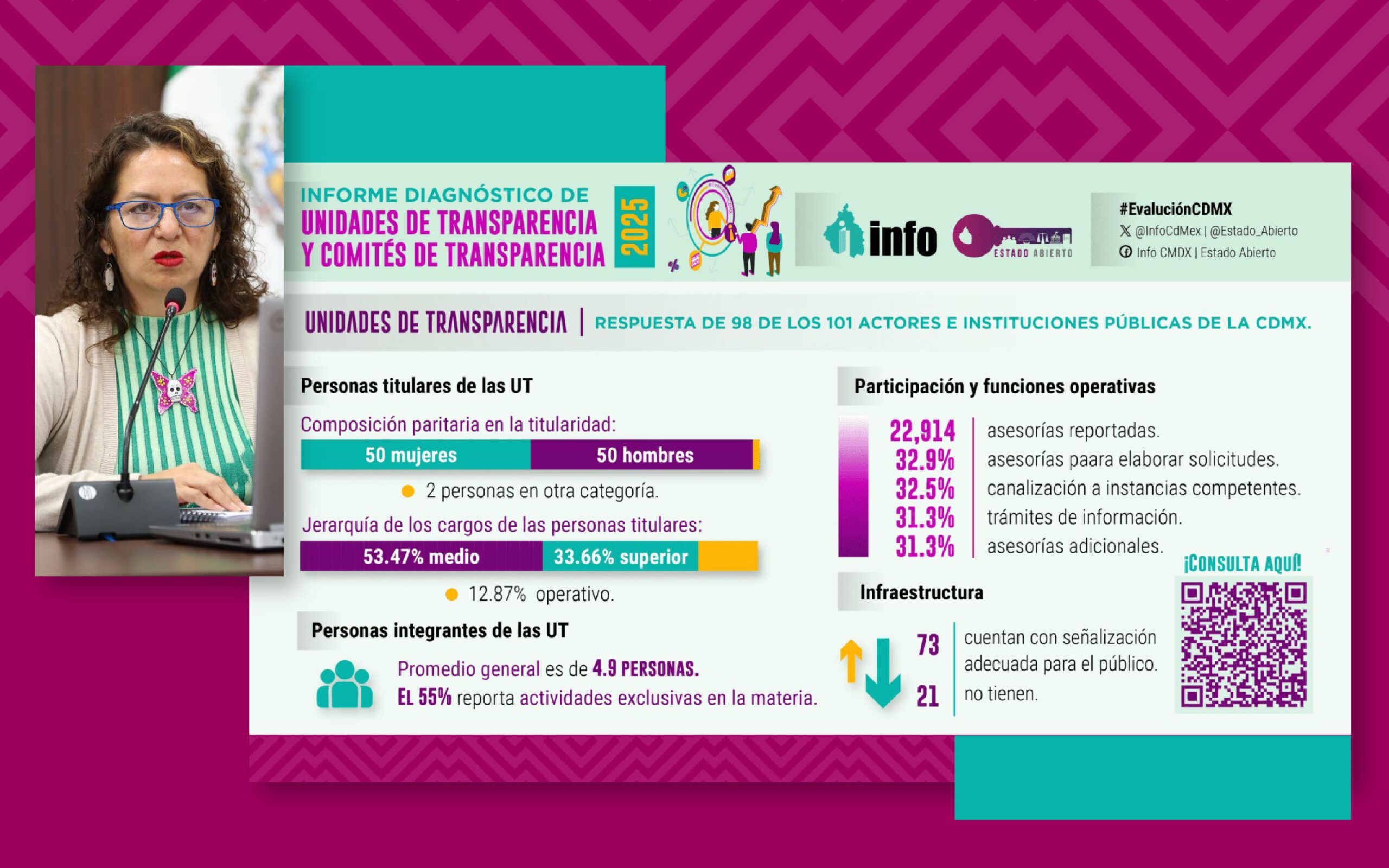El informe ofrece una radiografía integral del cumplimiento y desempeño en materia de transparencia, explicó la Comisionada María del Carmen Nava. Identifica avances en paridad