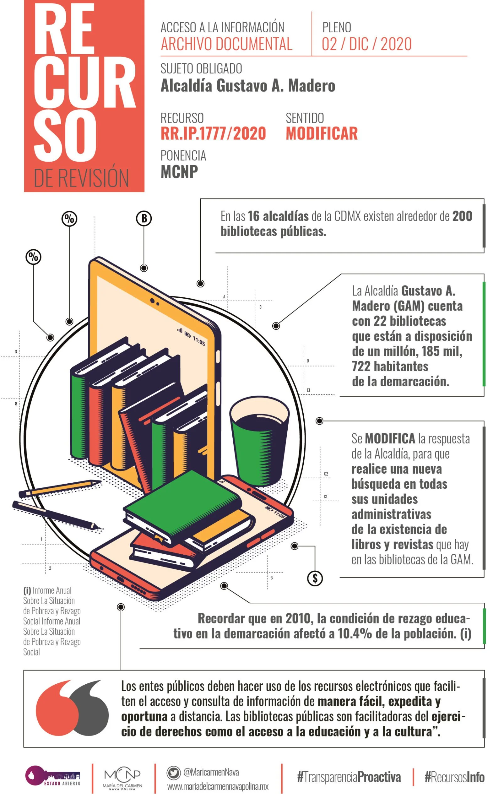 - En esta ocasión comentaré el proyecto de resolución del expediente INFOCDMX/RR.IP.1777/2020, en donde la persona solicitante se inconformó por la respuesta incompleta brindada por la Alcaldía Gustavo A. Madero, a la que le requirió información respecto de las bibliotecas en esa demarcación.