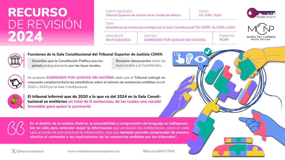 Posicionamiento relativo a la resolución del expediente INFOCDMX/RR.IP.2263/2024 Antecedentes del caso Me gustaría abordar el recurso de revisión INFOCDMX/RR.IP.2263/2024 interpuesto en contra del Tribunal Superior