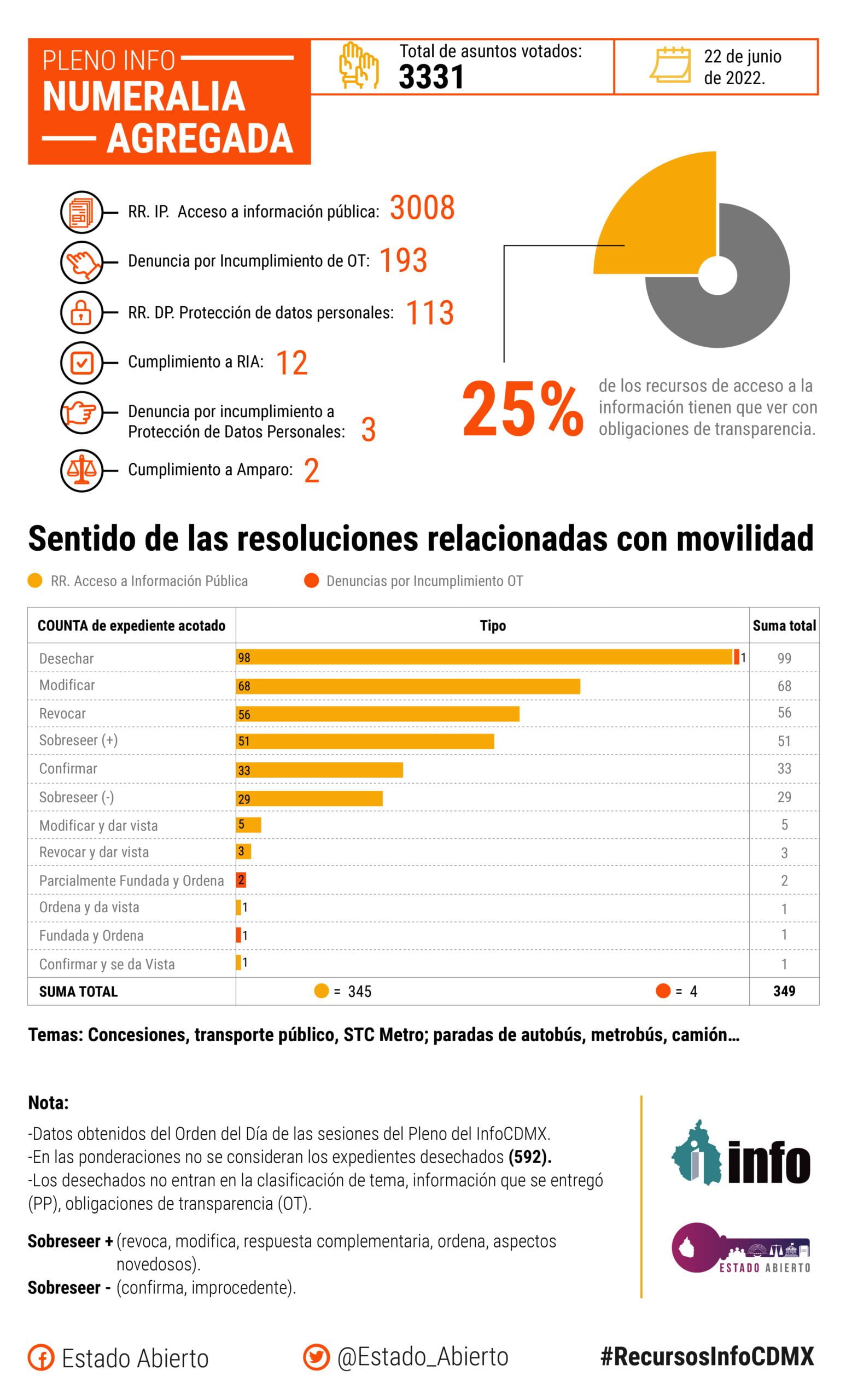 Numeralia 22 de junio 2022 Tipo Total RR.IP. Acceso a información pública 3008 Denuncia por Incumplimiento de OT 193 RR.DP. Protección de datos personales 113