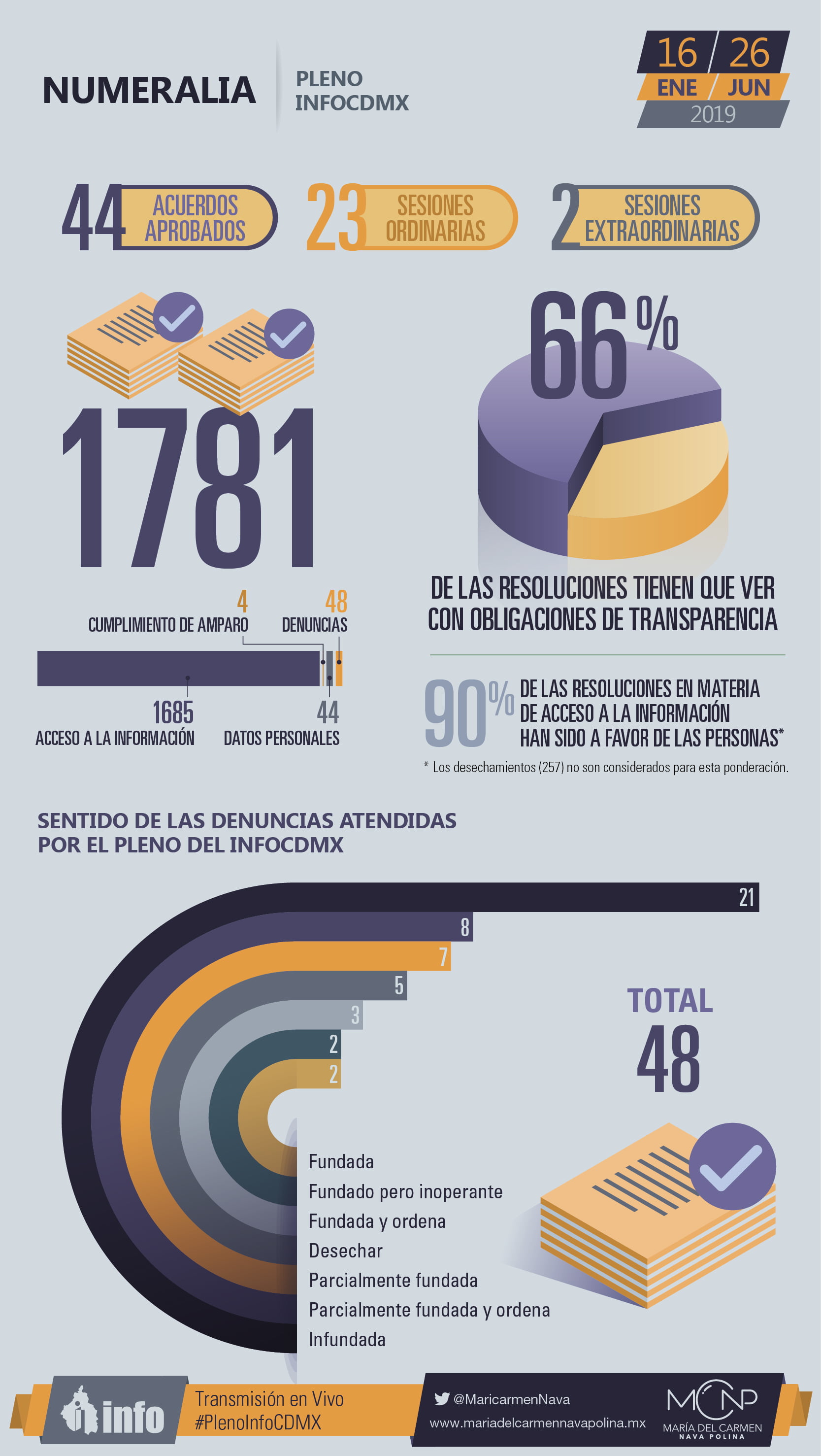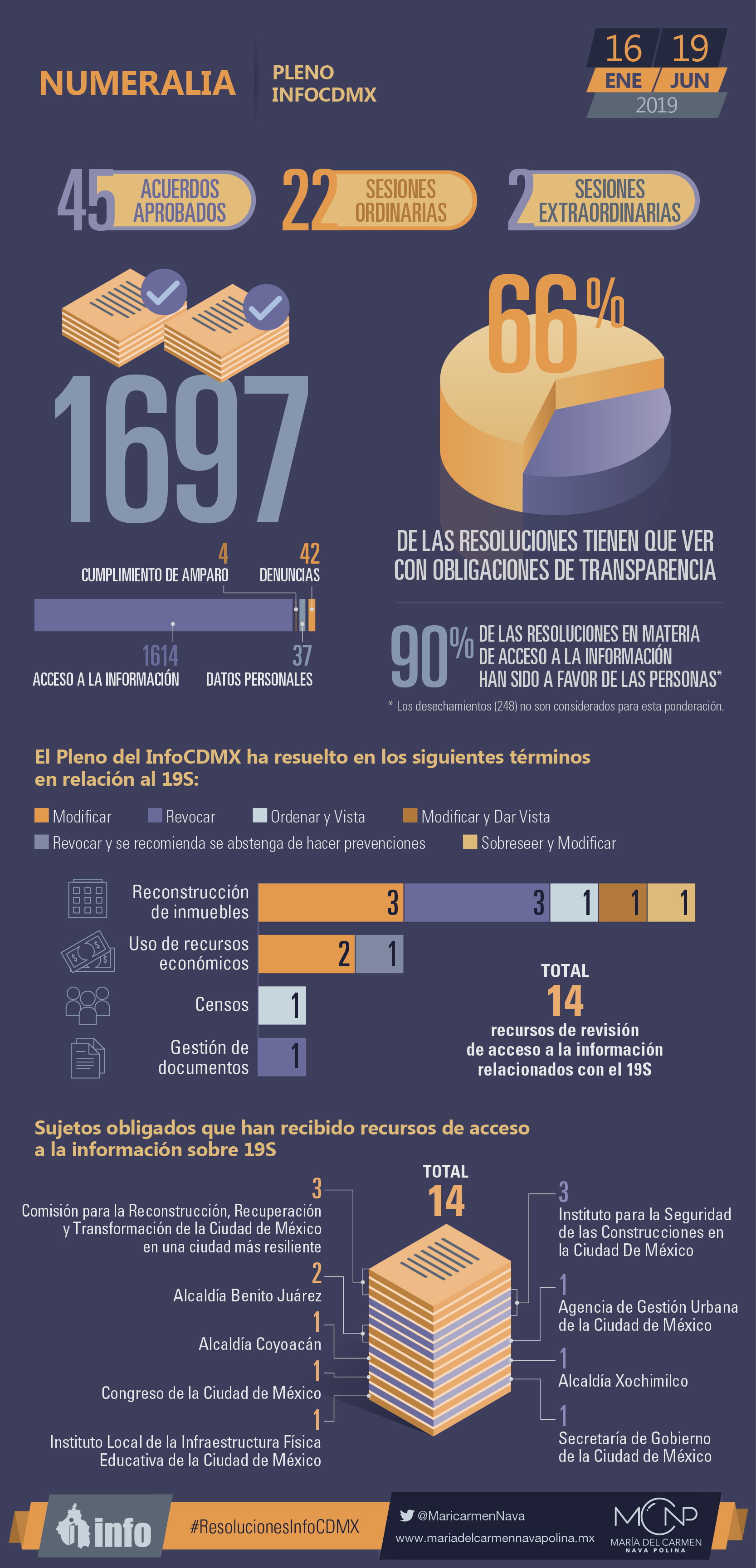 Del 16 de enero al 26 de junio de 2019, el Pleno del InfoCDMX, resolvió un total de 1781 recursos de revisión en materia de acceso a la información, el 66% de las resoluciones estaban directamente relacionadas con obligaciones de transparencia.