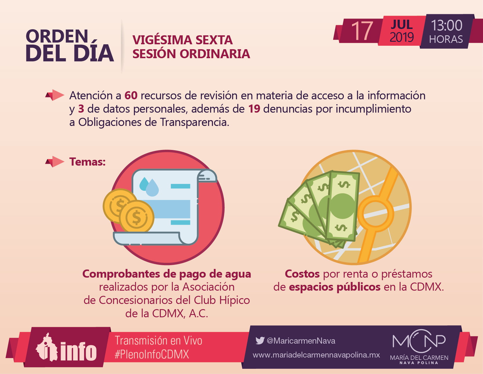 La vigésima sexta sesión ordinaria del Pleno del InfoCDMX, se llevó a cabo el 17 de julio de 2019. Se resolvieron 60 recursos de revisión en materia de acceso a la información. Además de 19 Denuncia por incumplimiento de Obligaciones de Transparencia y tres recursos en materia de Protección de Datos Personales.