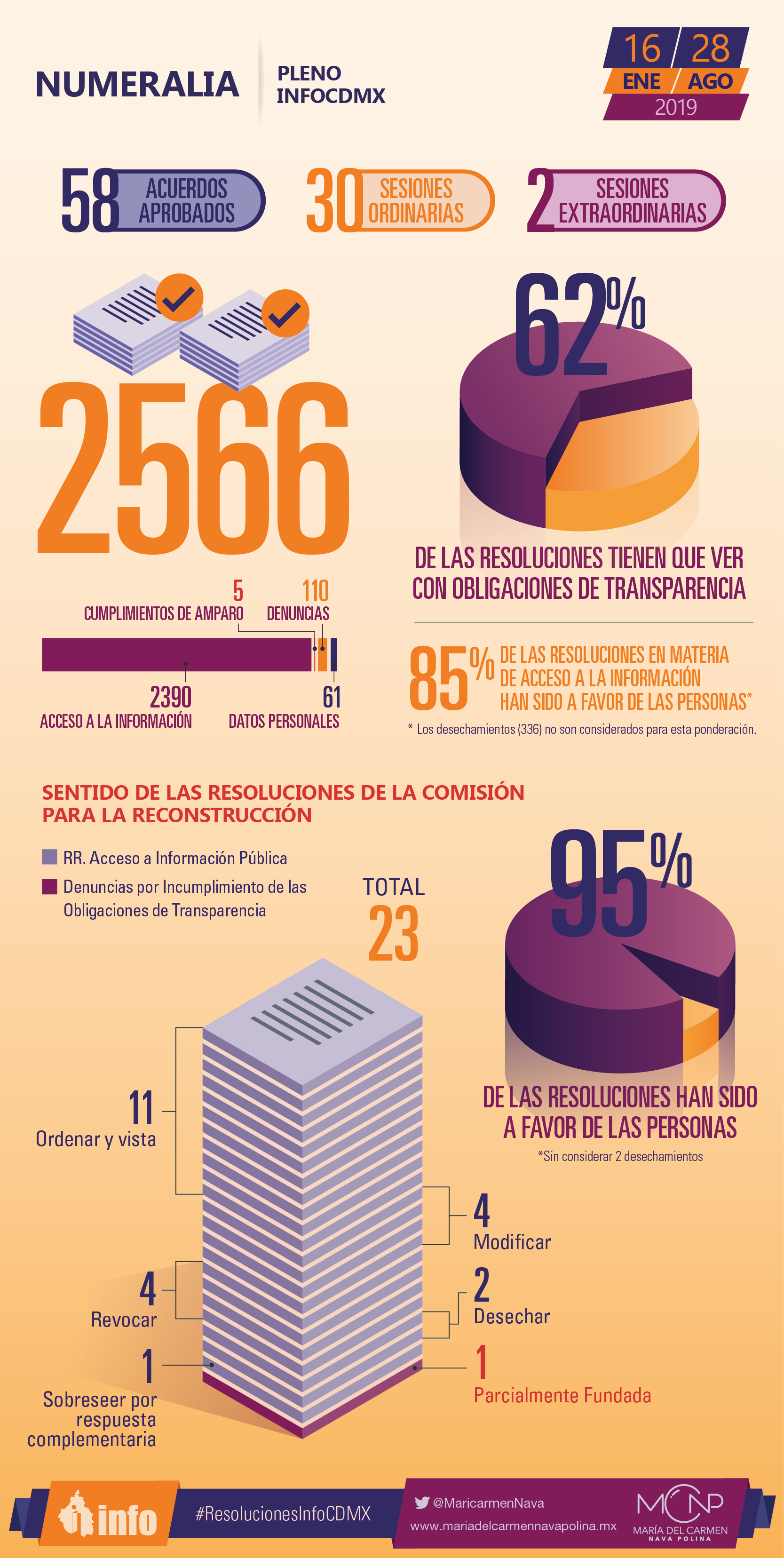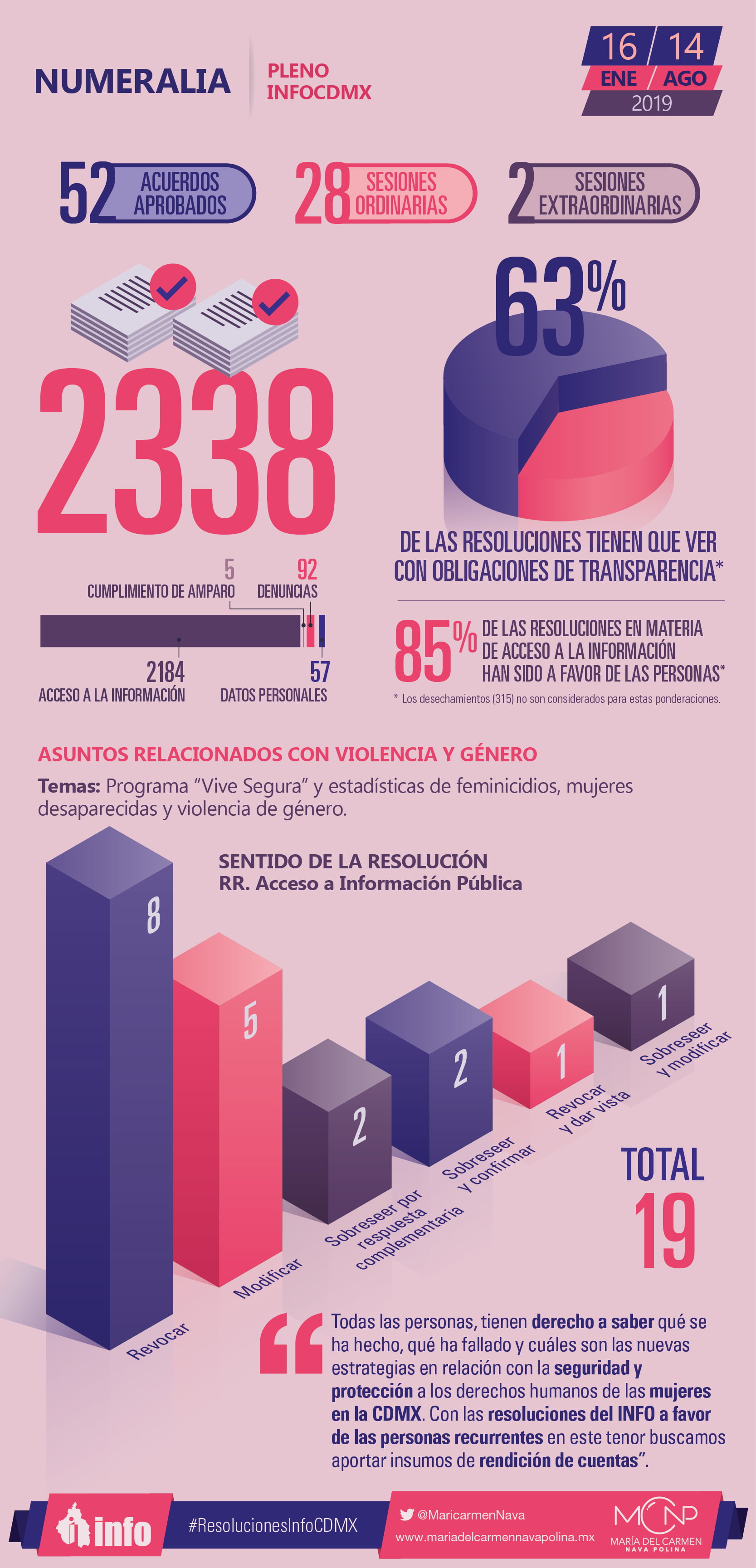 Del 16 de enero al 14 de agosto de 2019, el Pleno del InfoCDMX, resolvió un total de 2184 recursos de revisión en materia de acceso a la información, el 63% de las resoluciones estaban directamente relacionadas con obligaciones de transparencia