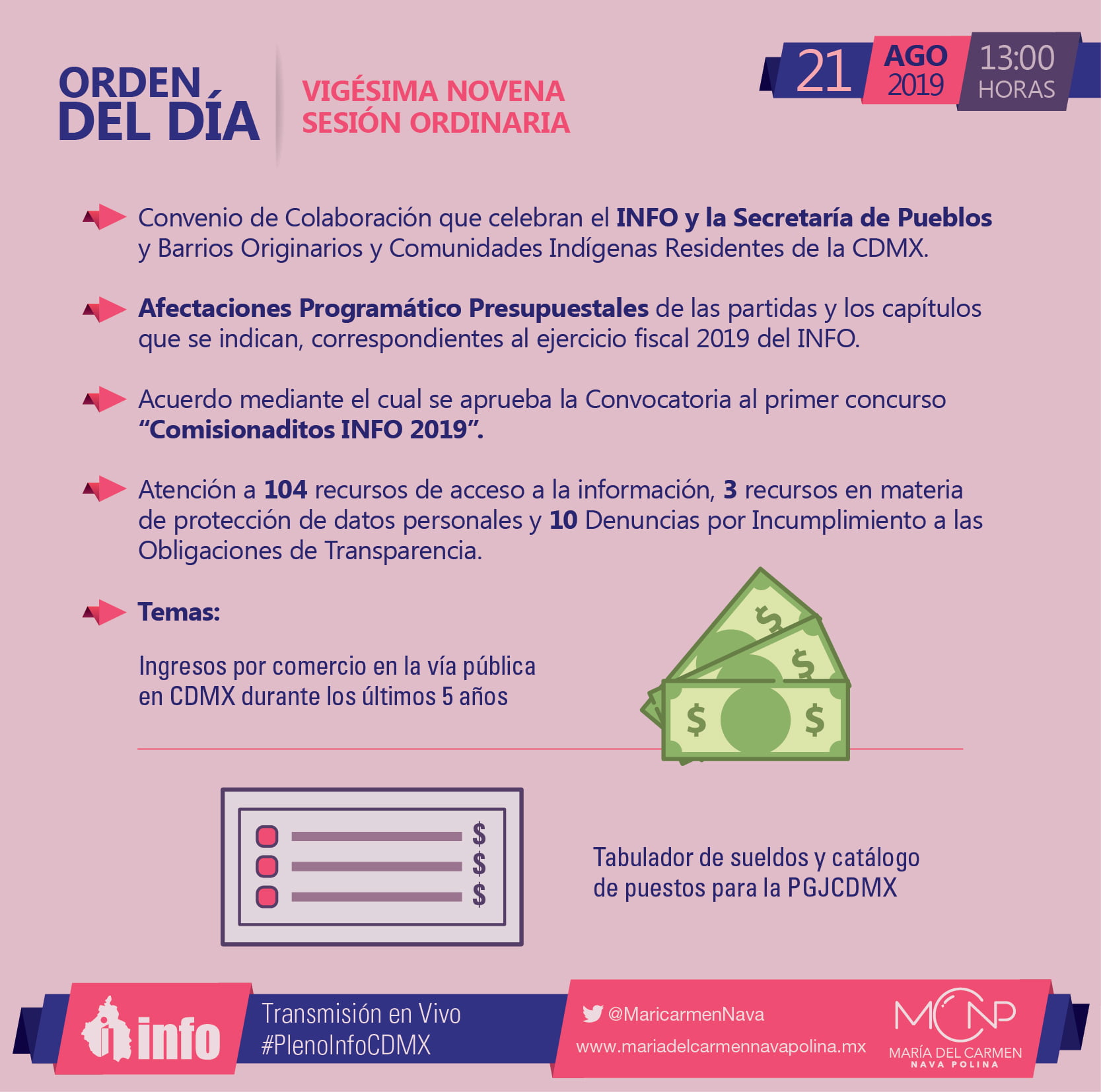 La vigésima novena sesión ordinaria del Pleno del InfoCDMX, se llevó a cabo el 21 de agosto de 2019. Se resolvieron 104 recursos de revisión en materia de acceso a la información.