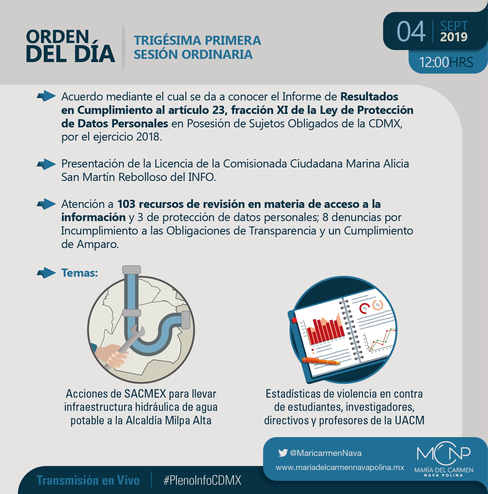 La trigésima primera sesión ordinaria del Pleno del InfoCDMX, se llevó a cabo el 4 de septiembre de 2019. Se resolvieron 103 recursos de revisión en materia de acceso a la información.